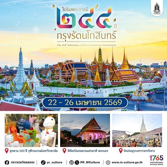 วธ. เตรียมจัดใหญ่ “งานใต้ร่มพระบารมี 244 ปี กรุงรัตนโกสินทร์” 22 – 26 เมษายน 2569